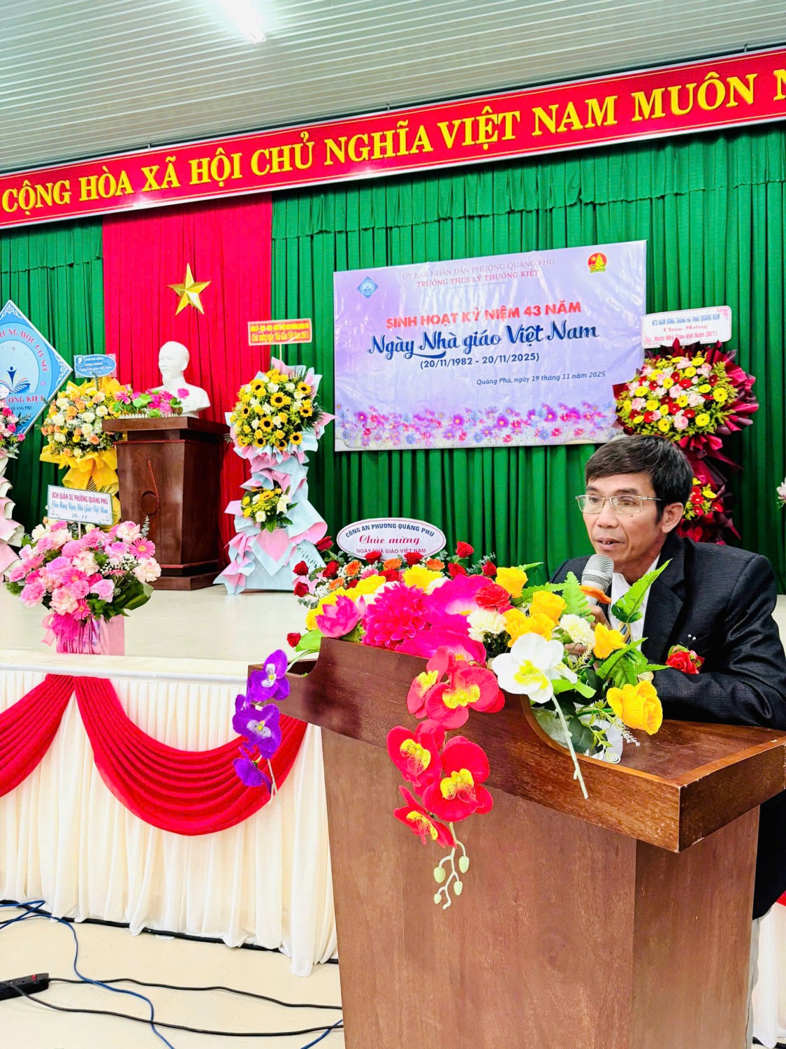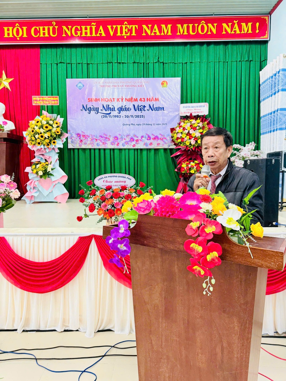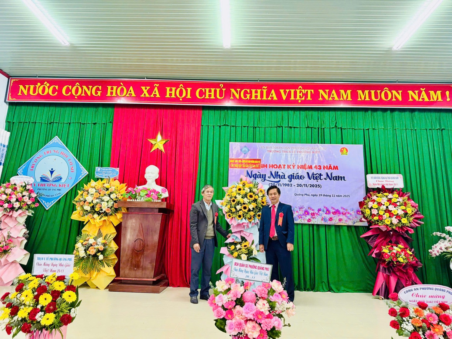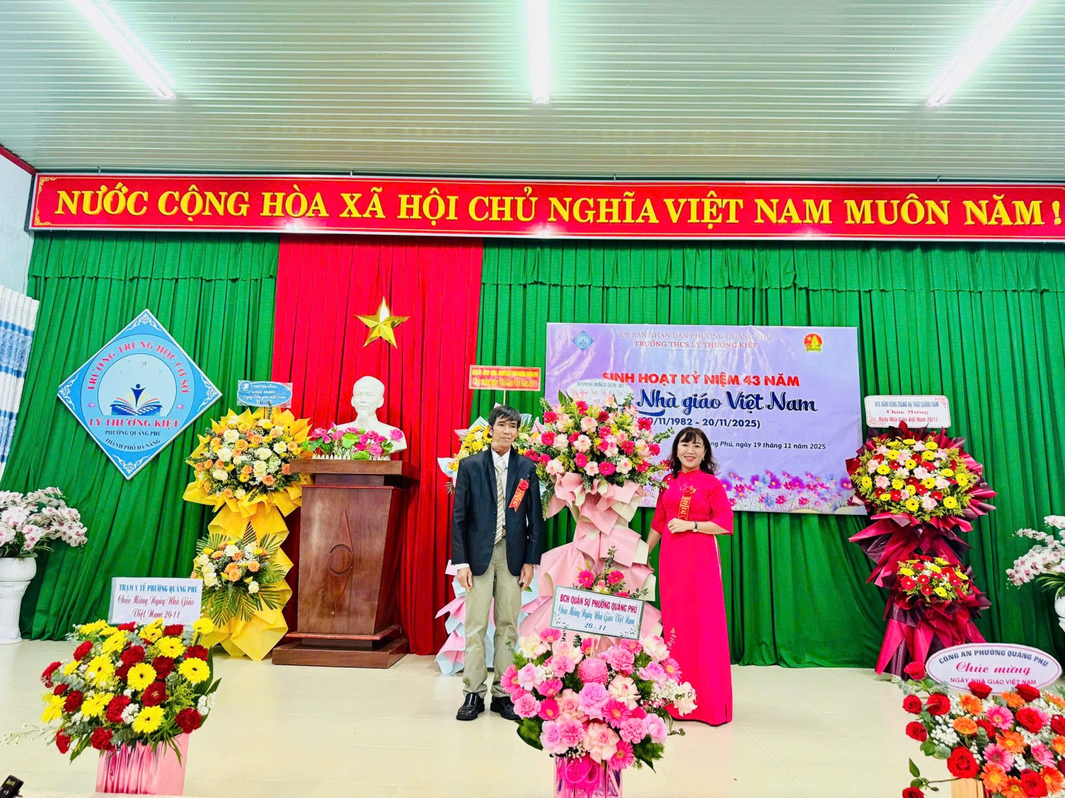 Nhà trường rất vinh dự được đón tiếp quý vị đại biểu; Ban đại diện cha mẹ học sinh; các đồng chí cán bộ quản lý; nhà giáo ưu tú Phan thị Bích Liễu, quý thầy cô Hưu trí, cùng toàn thể cán bộ, giáo viên, nhân viên về tham dự. Đặc biệt, Trường THCS Lý Thường Kiệt trân trọng cảm ơn Lãnh đạo UBND – UBMTTQ Phường Quảng Phú đã đến thăm, chúc mừng và gửi tặng những lẵng hoa tươi thắm nhân dịp kỷ niệm 43 năm Ngày Nhà giáo Việt Nam.
