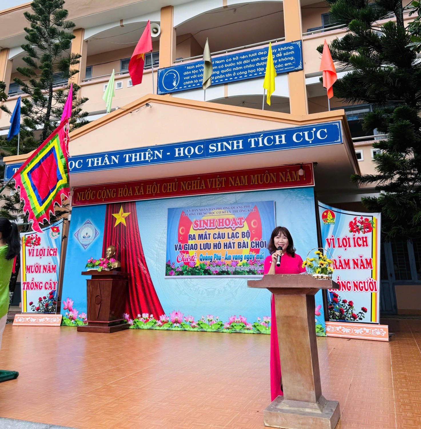Sáng nay, ngày 22/12/2025, Trường THCS Lý Thường Kiệt tổ chức sinh hoạt ra mắt câu lạc bộ và giao lưu giao lưu hô hát Bài chòi với chủ đề “Quảng Phú – Âm vang ngày mới”. Đây là hoạt động có ý nghĩa thiết thực nhằm bảo tồn, phát huy giá trị Nghệ thuật Bài chòi dân gian – Di sản văn hóa phi vật thể đại diện của nhân loại, đồng thời tạo sân chơi văn hóa lành mạnh cho cán bộ, giáo viên và học sinh nhà trường.
