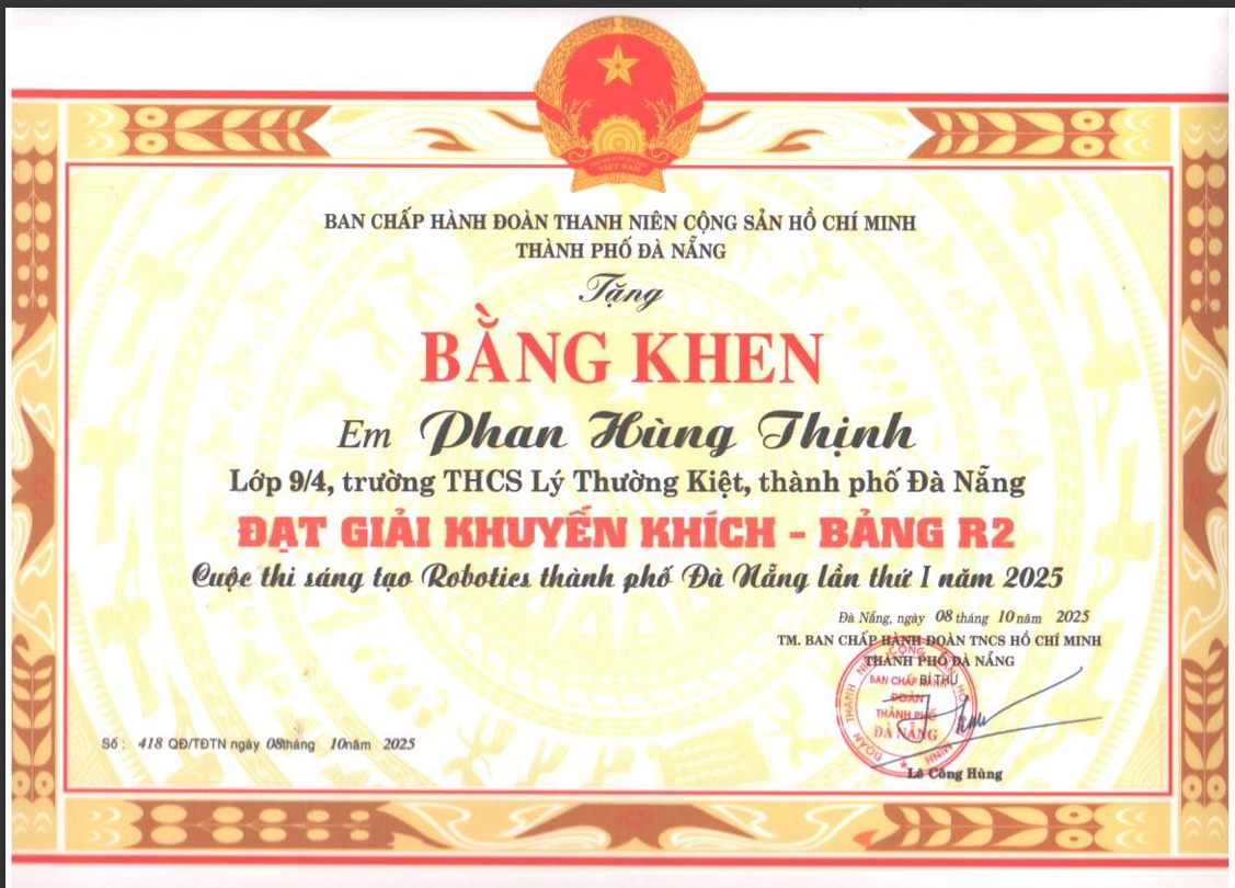 📜 Hai em đã được Ban Chấp hành Đoàn TNCS Hồ Chí Minh thành phố Đà Nẵng trao tặng Bằng khen vì đã có thành tích xuất sắc tại cuộc thi.
