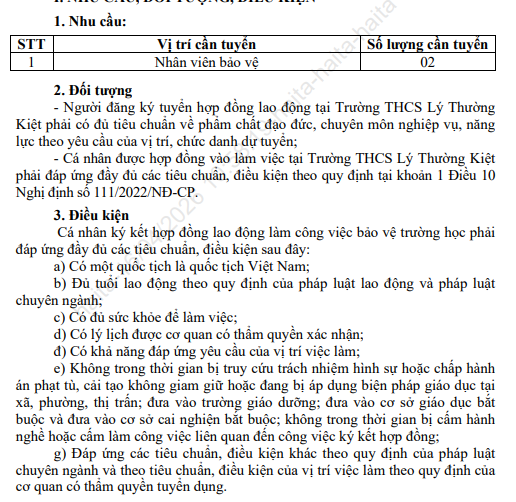 THÔNG BÁO Về việc tuyển dụng nhân viên hợp đồng làm công tác bảo vệ.