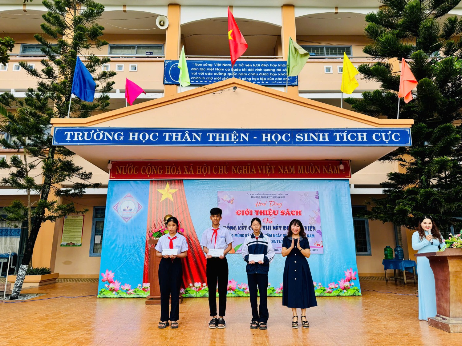 Tiếp nối chương trình, bạn Thiên Ân - lớp 8/1 và bạn Bảo Châu – lớp 8/6 đã mang đến phần giới thiệu sách vô cùng cuốn hút. Qua lời chia sẻ chân thành, hai bạn đã truyền cảm hứng đọc sách và gửi gắm thông điệp tri ân thầy cô thông qua những trang sách giàu giá trị.